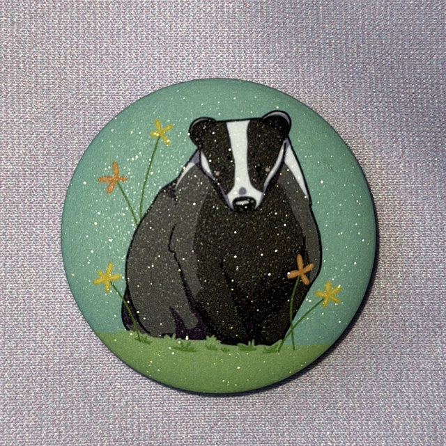 ♥ Pinssissä esiintyy mäyrä ja kukkia