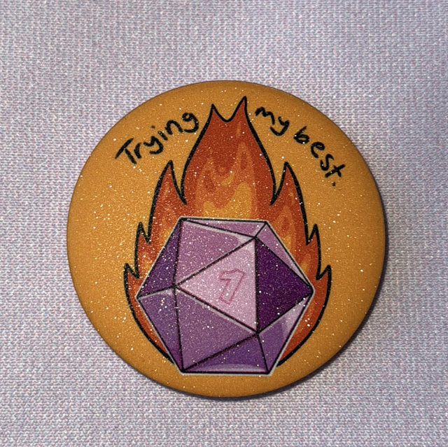 ♥ Pinssissä esiintyy D20-noppa joka näyttää lukua 1 ja teksti ”Trying my best.”